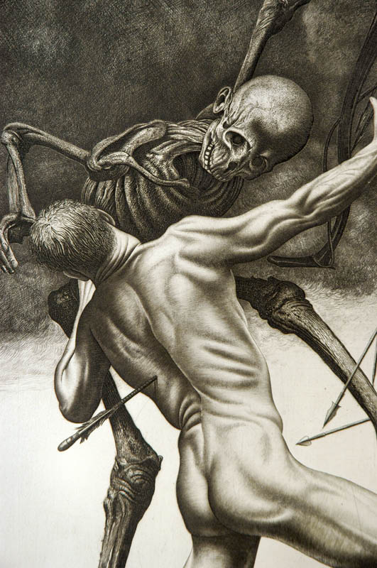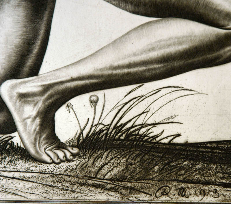 Im Jahre 1913 entstand der “Todeskampf“ – eines von Müllers nicht allzu vielen Todesbildern, dessen grausige Schönheit und Größe Klingers würdig wäre. Ein nackter Held – von hinten gesehen – an der Todeswunde in der linken Rückenseite eben zusammensinkend – dem Tode verfallen, der als Vollgerippe mit erhobenem Bein jenseits neben ihm steht und jauchzend eben die Rechte ausstreckt, um seinem Opfer den Garaus zu machen. Dicker, geballter Wetterhimmel hängt schwer über diesem Drama vom Heldentod. Mit ergreifender Kunst ist dieser Körper und das Spiel der Muskeln – dieses Zusammensinken und das Zurückfallen dieses jungen, vollhaarigen Hauptes geschildert– – sind hell und dunkel verwendet, um die düstere Größe des Vorgangs zu unterstreichen. Auch dieses Meisterwerk gehört zu den allerschönsten des Dresdner Meisters ...